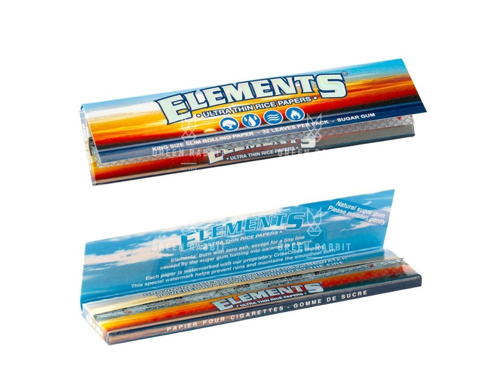 Balicí papírky Elements, vyrobené z čistého rýžového papíru, připomínají krásné vzpomínky na minulost. Čistá rýže způsobuje, že balicí papírky hoří extra pomalu a čistě, bez popela. Do balicího papírku je přidána tenká proužek akáciové gumy. Jediným zbytkem po hoření je karamelizace akáciové gumy. Vyzkoušejte tento balicí papírky z čistého rýžového papíru. Podívejte se na rozdíl v tom, jak tento balicí papírky hoří. Nebudete zklamáni. Papír je vybaven patentovaným systémem vodoznaku Rolling Supreme.